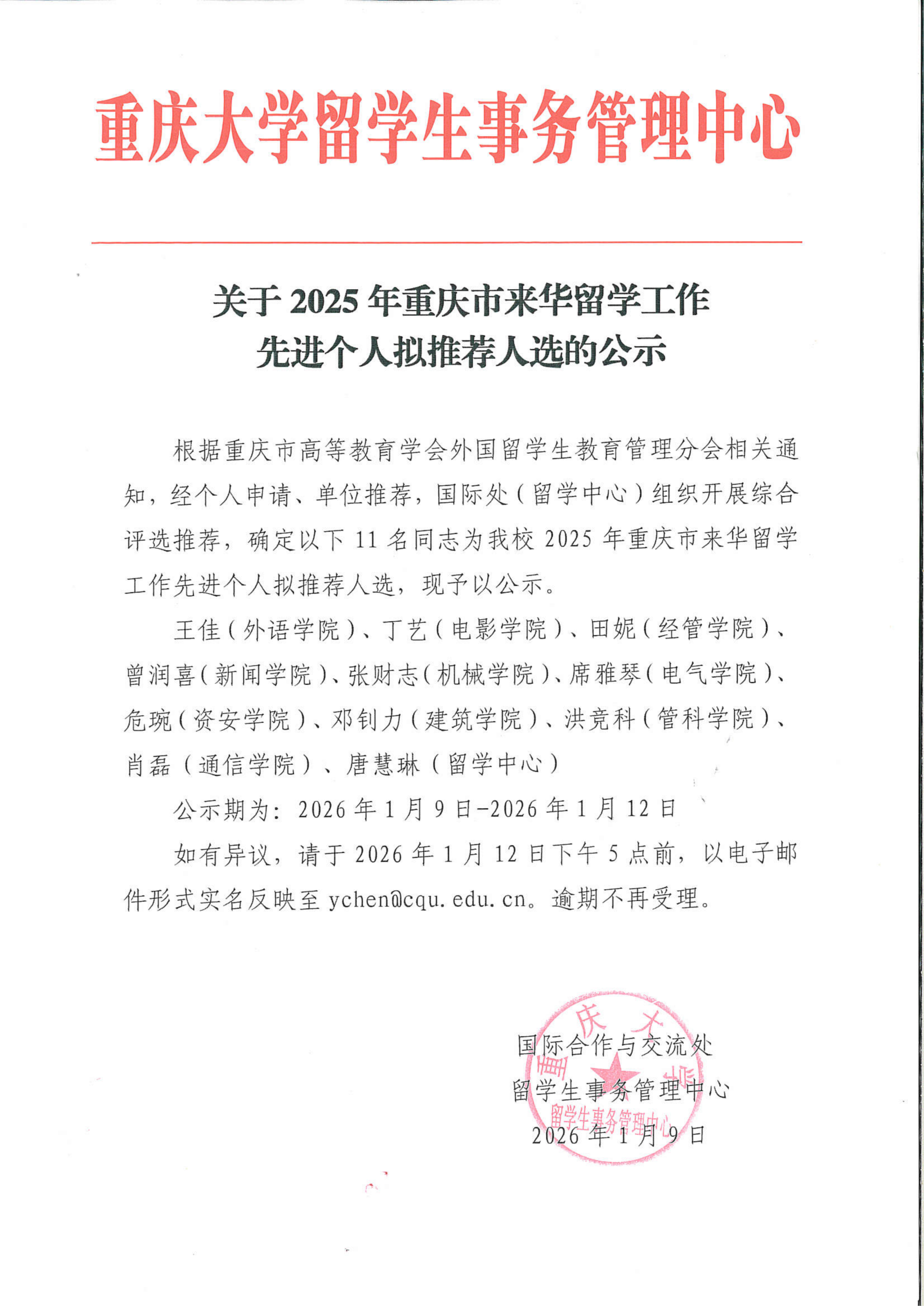 关于2025年重庆市来华留学工作先进个人拟推荐人选的公示
